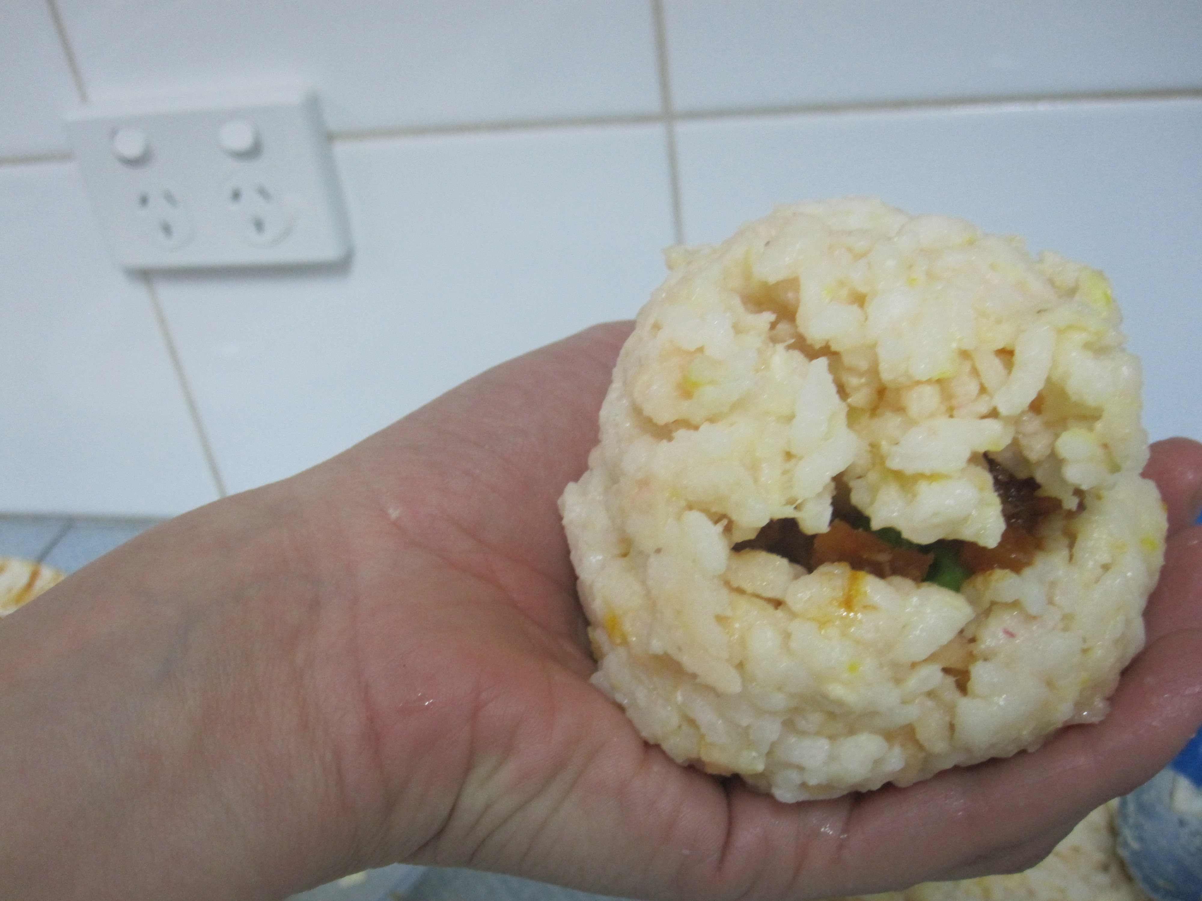 I found it easiest to work with when the rice was lukewarm and the ragu was cold. Have a bowl of water next to you, wet hands are the key to not ending up with rice all over yourself and the kitchen.