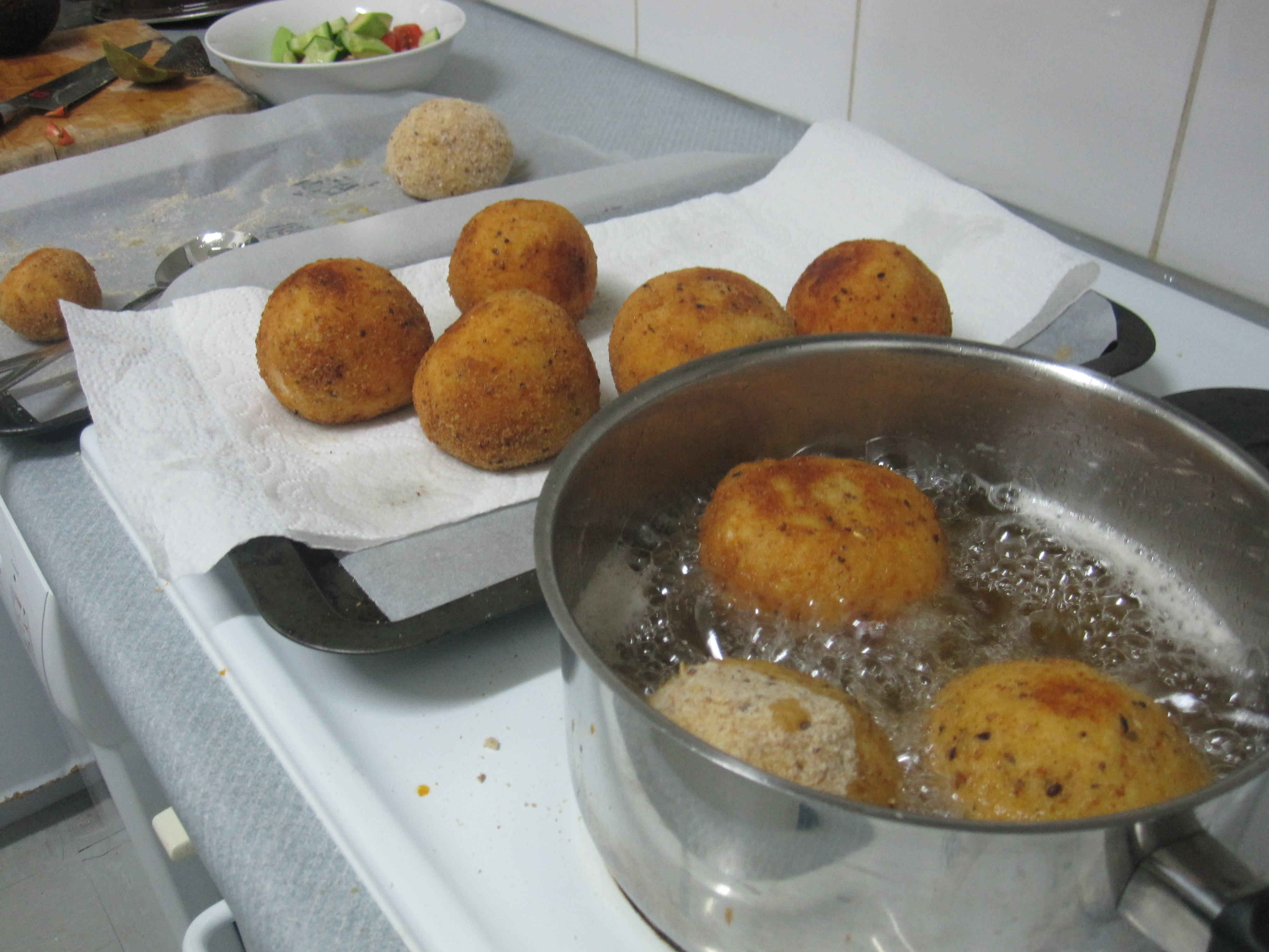 Deep-fry the balls in hot oil (I used vegetable oil, you can use canola, peanut sunflower, or light olive oil) until golden brown.